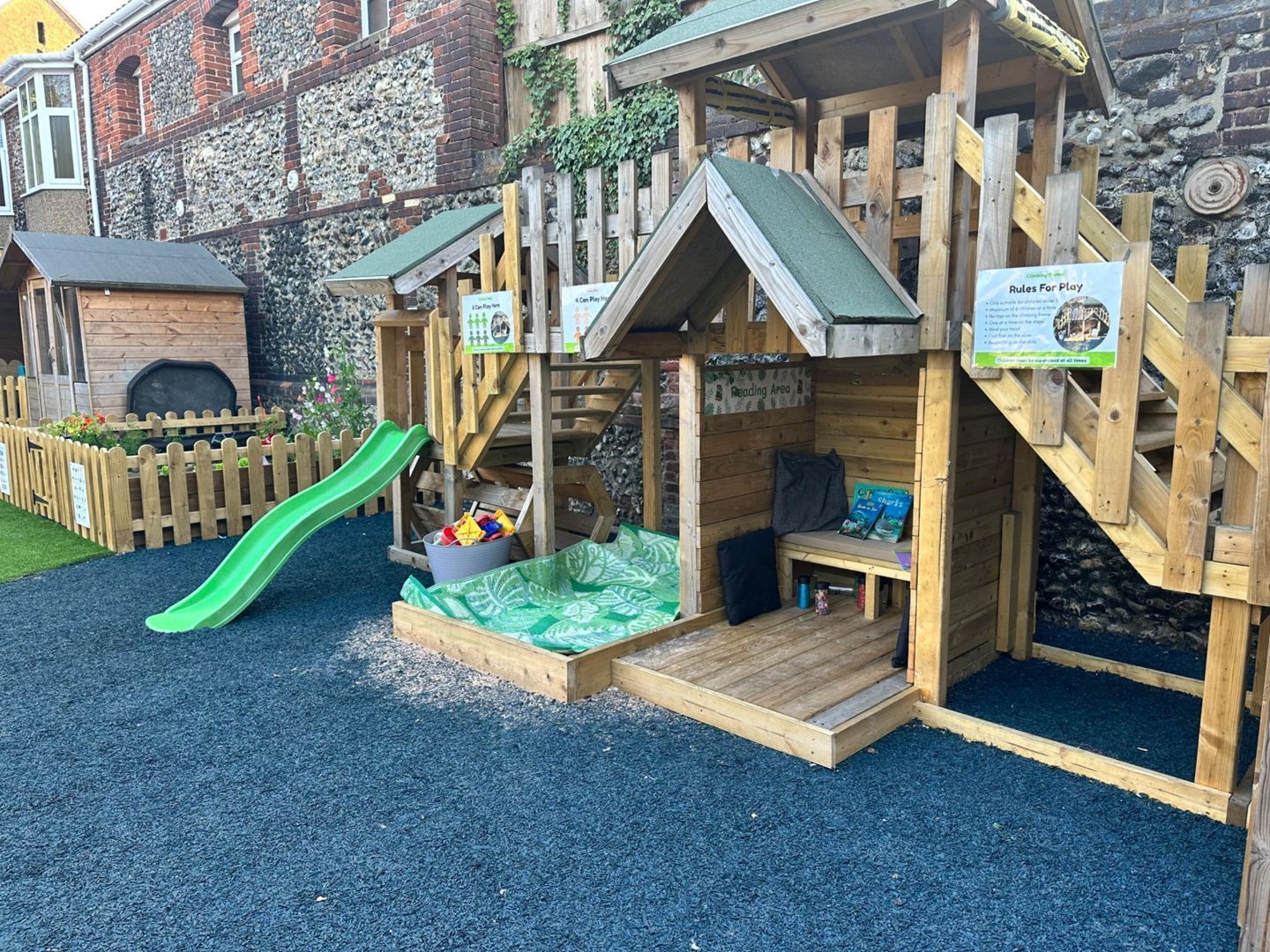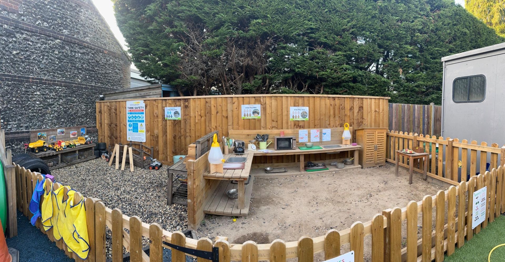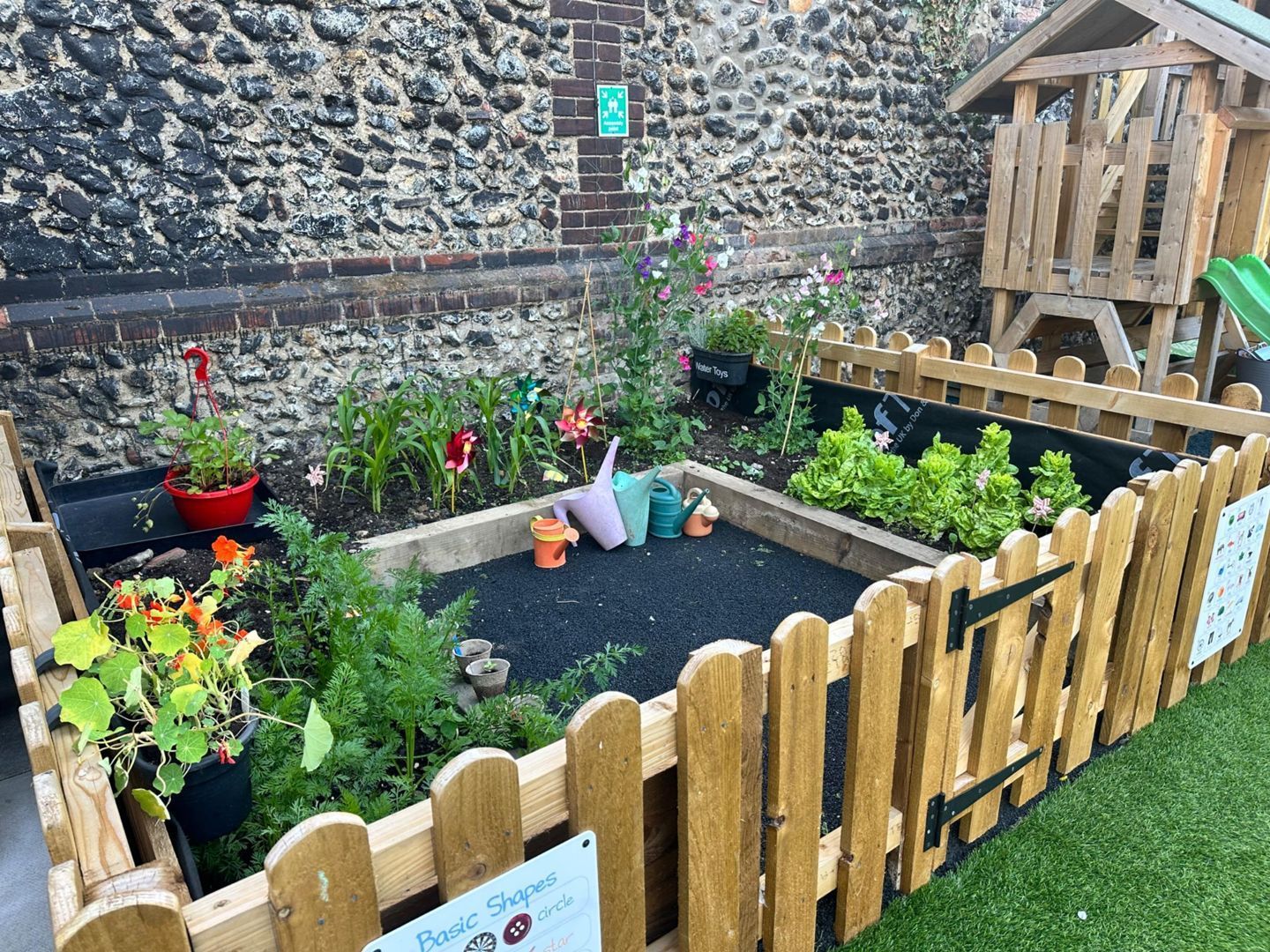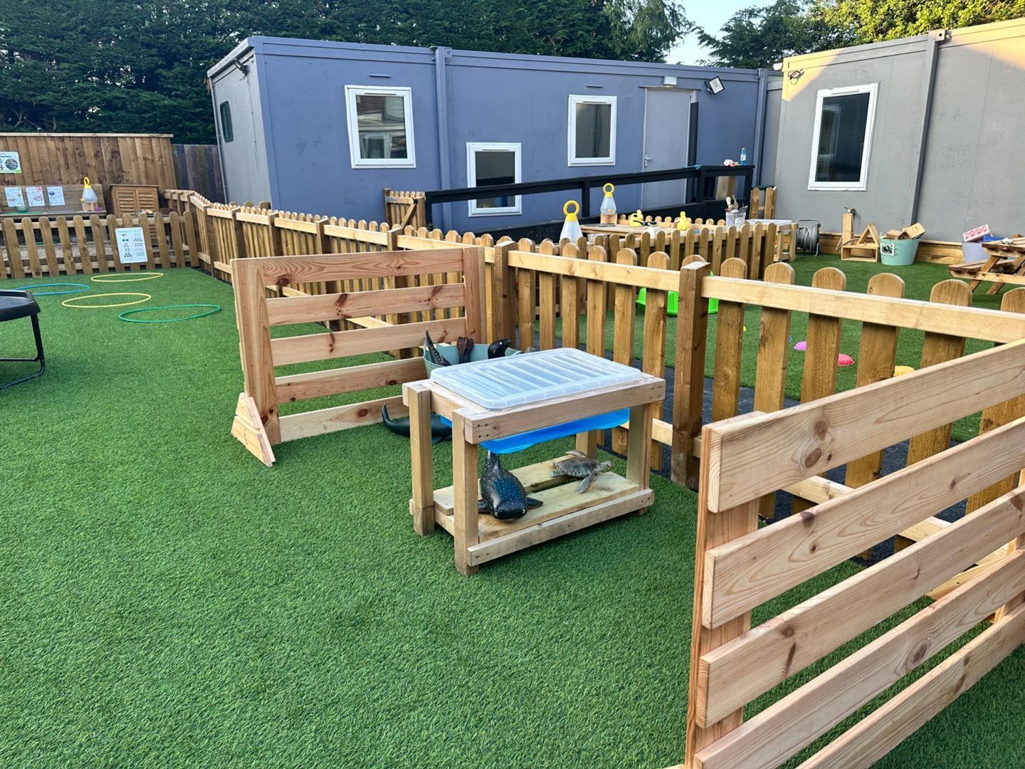 The outdoor play space from Buds is shared with the Orchard Room. This Play space has been designed to allow pre-school aged children to play securely and safely in the open environment. The ground covering consists of Astro turf, sponge chippings, and rubber matting allowing children to explore different surfaces and textures. There is a range of activities including water and messy play trays, sand pit, bikes, wooden climbing frame, digging area, planting area and much more all encouraging positive development particularly in the large motor skills area.