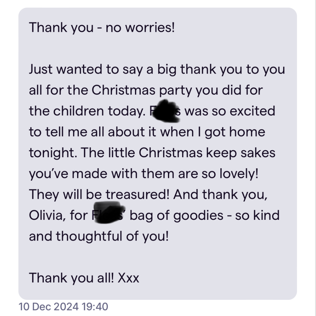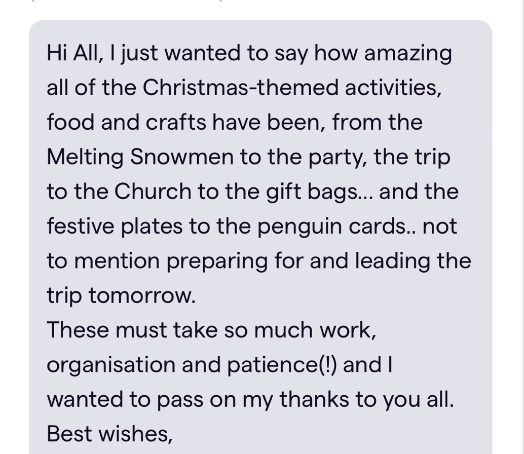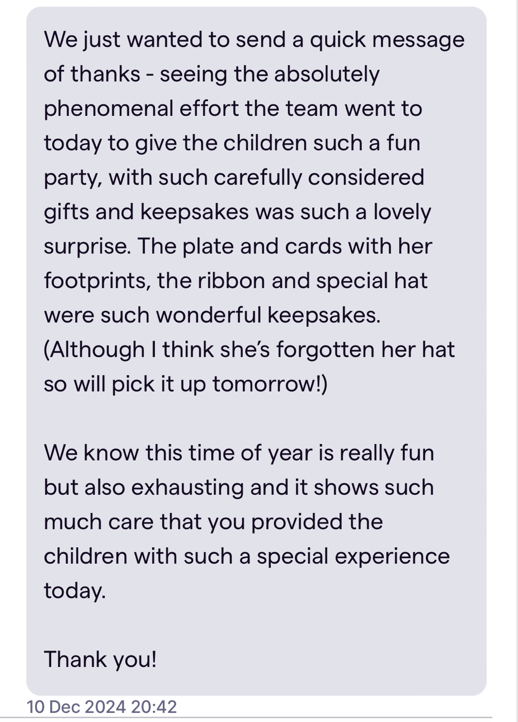 - We just want to say to all of the staff that you are all wonderful and you all do a magnificent job! You are all so good with M and have supported us through some very difficult times. We cannot thank you all enough M has come on so much since starting nursery and we knew from the very first day when we came to look around that this would be the best nursery. Words cannot express how thankful we are to you all absolutely amazing! M, Dad and I will miss you all but you will still see him next Thursday in his little uniform! This includes you too Zoe manager you have been amazing helping us through some tough and upsetting times xxxxxx (Famly message Sep 2024)
