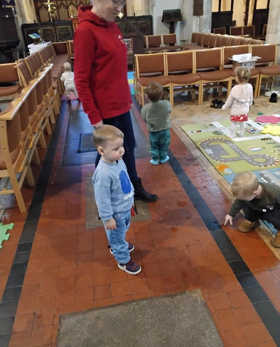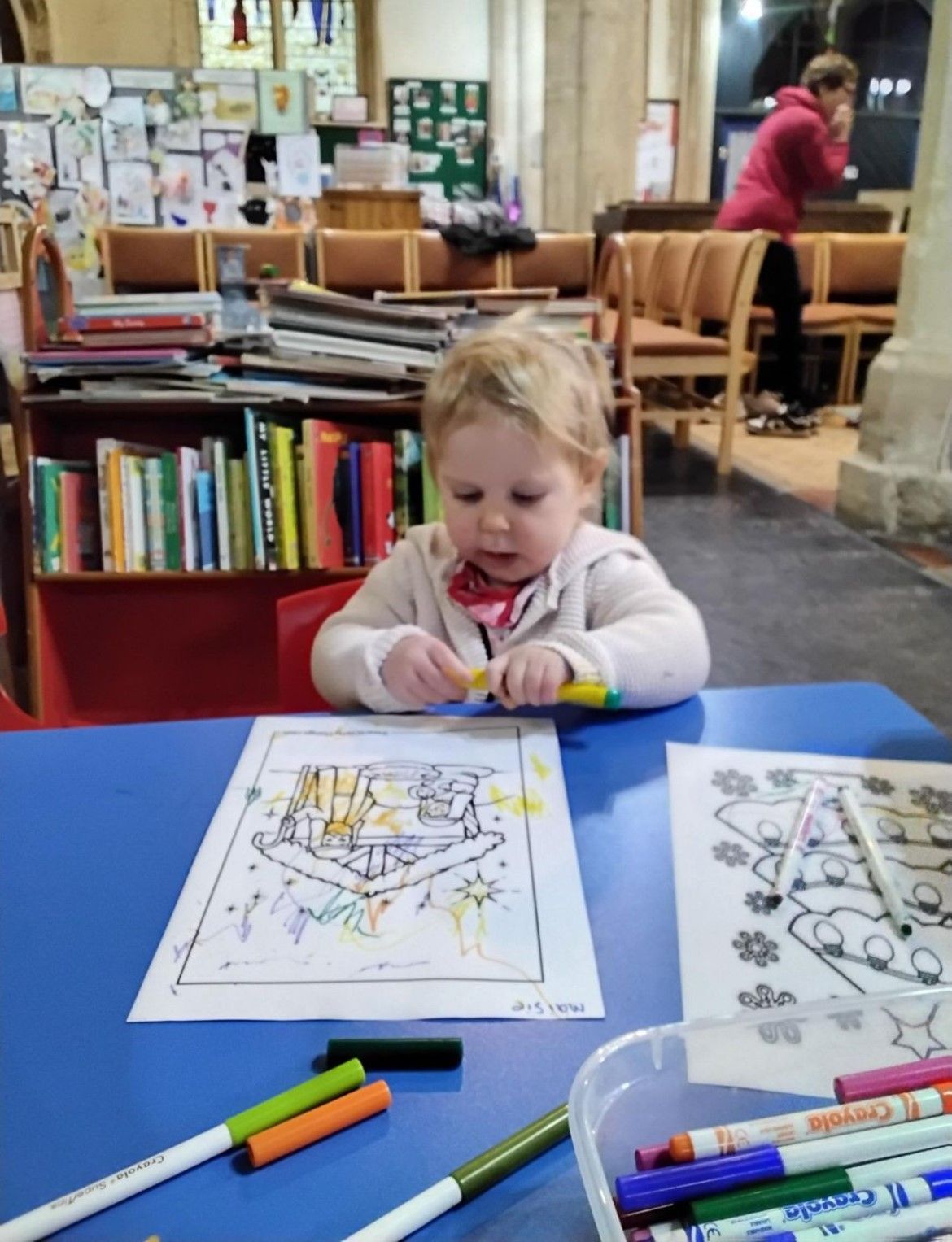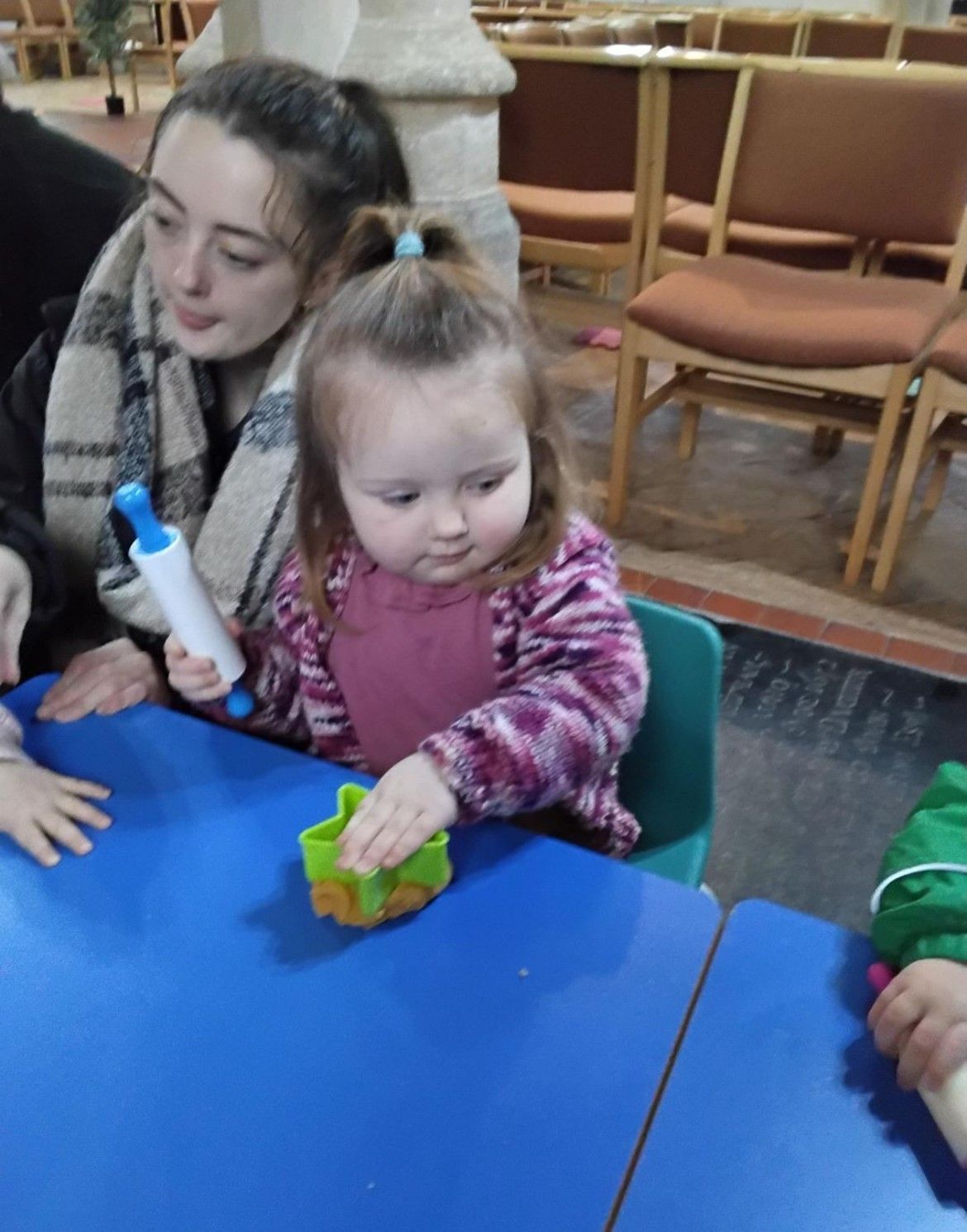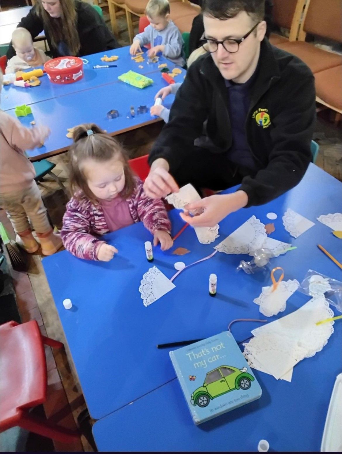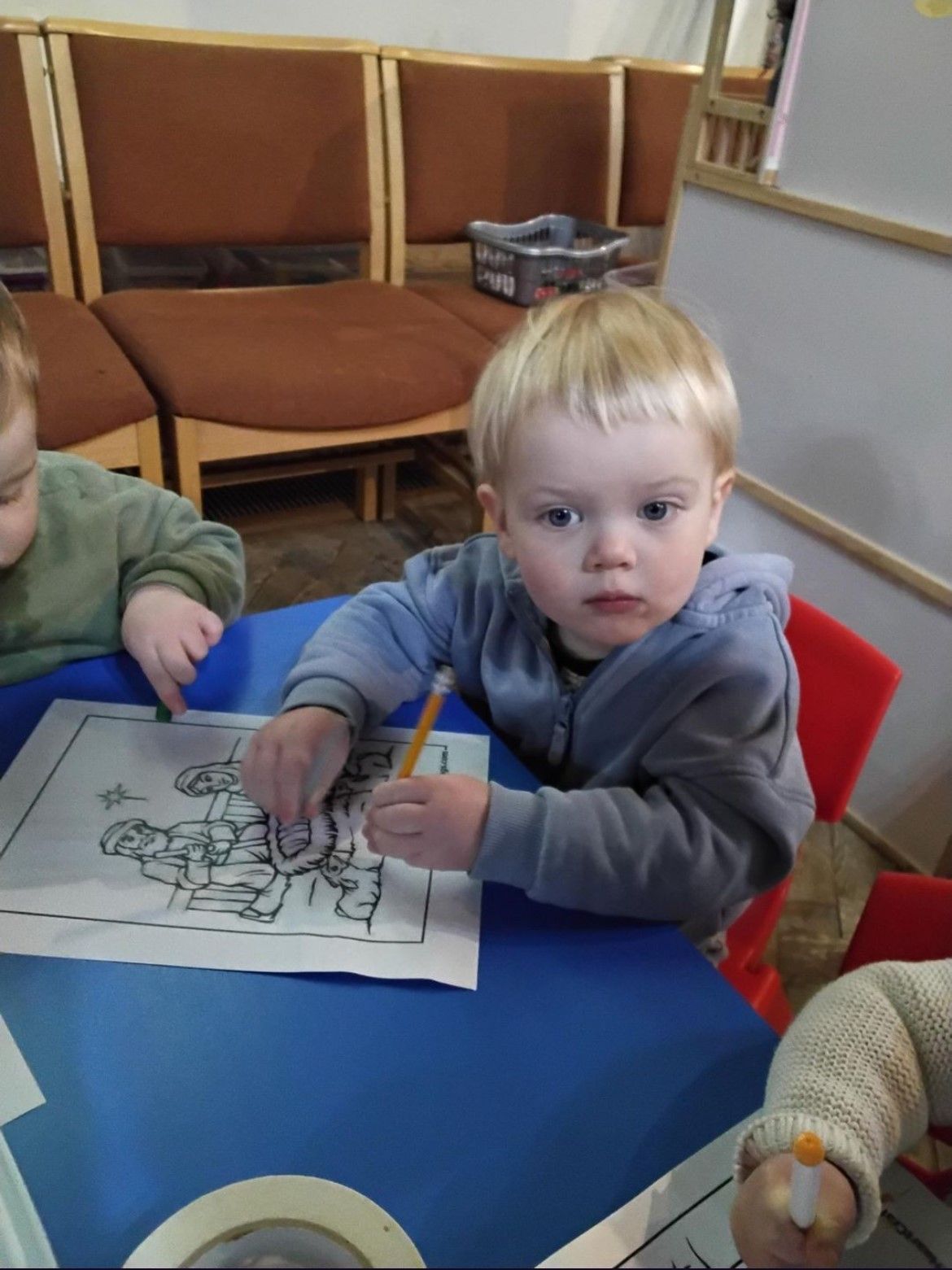 We kicked things off with a delicious fruit snack before getting ready for our adventure. As we walked through the village towards the church, we spotted the park, the pharmacy, and the shop, along with plenty of buses and cars whizzing by. Once we arrived at the church, we gathered for a story and enjoyed singing the donkey song together. We even caught a glimpse of baby Jesus peacefully sleeping! After story time, we headed to the craft tables where we had fun with playdough, colouring, and making paper angels.