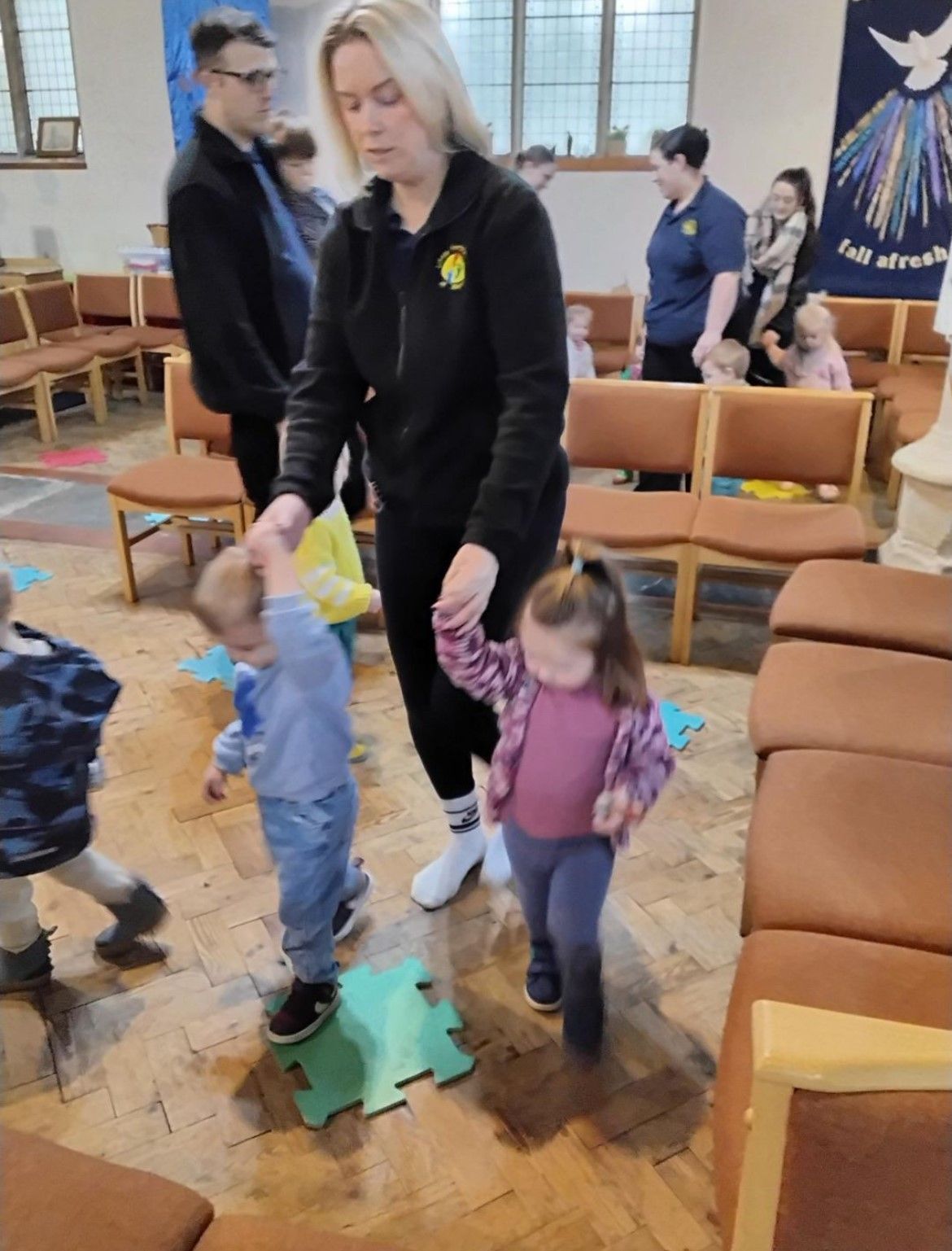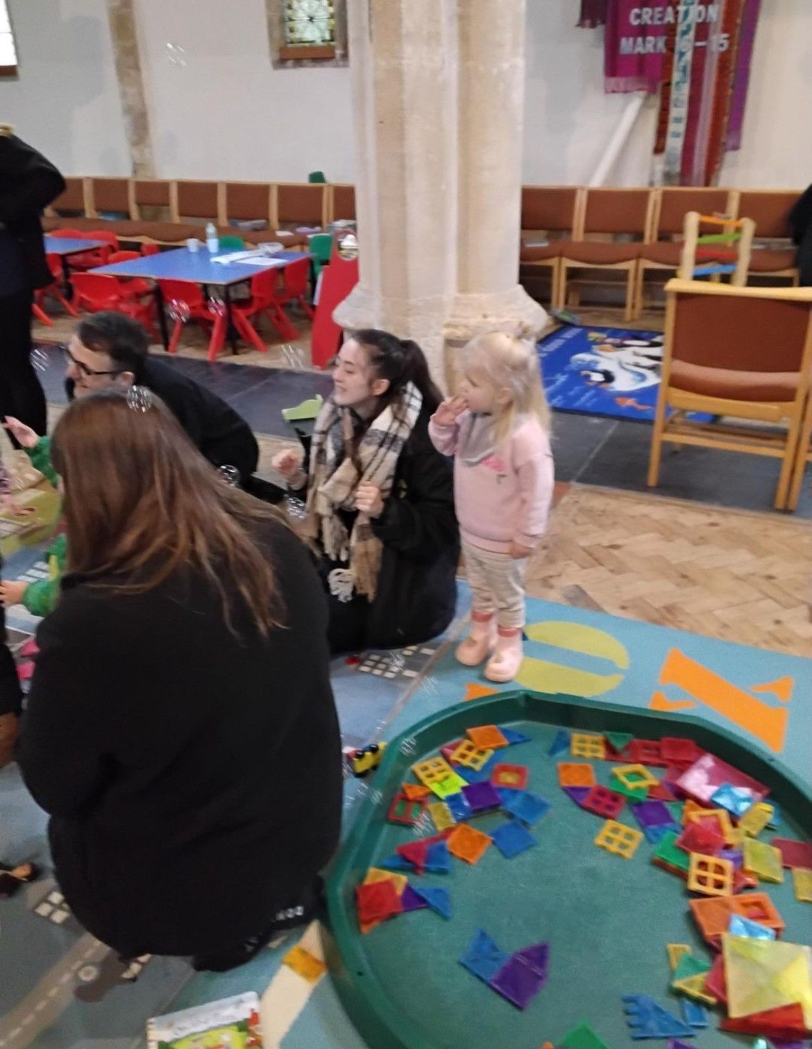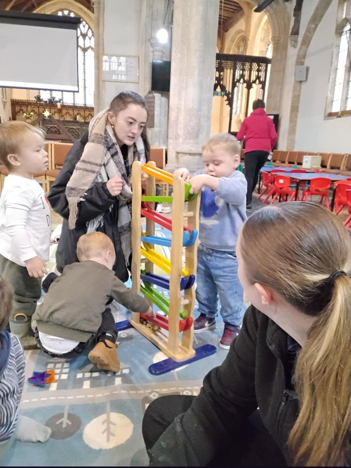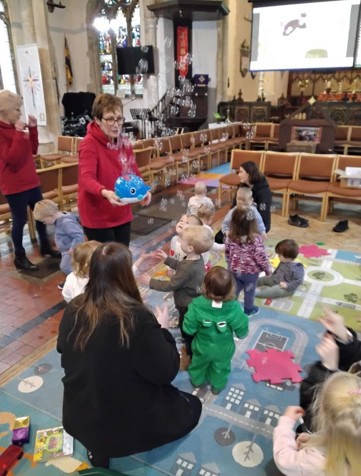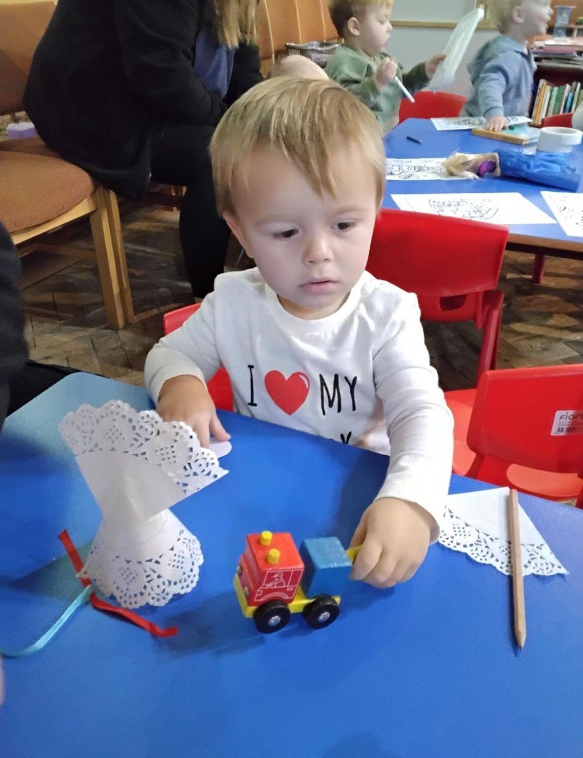 We kicked things off with a delicious fruit snack before getting ready for our adventure. As we walked through the village towards the church, we spotted the park, the pharmacy, and the shop, along with plenty of buses and cars whizzing by. Once we arrived at the church, we gathered for a story and enjoyed singing the donkey song together. We even caught a glimpse of baby Jesus peacefully sleeping! After story time, we headed to the craft tables where we had fun with playdough, colouring, and making paper angels.