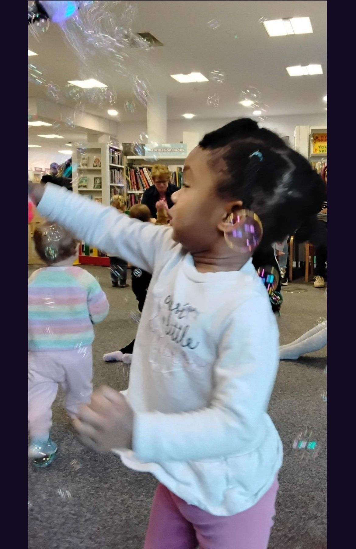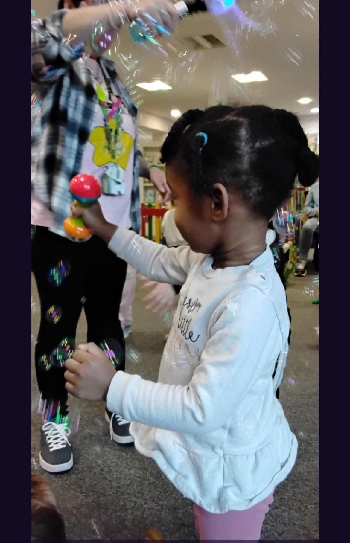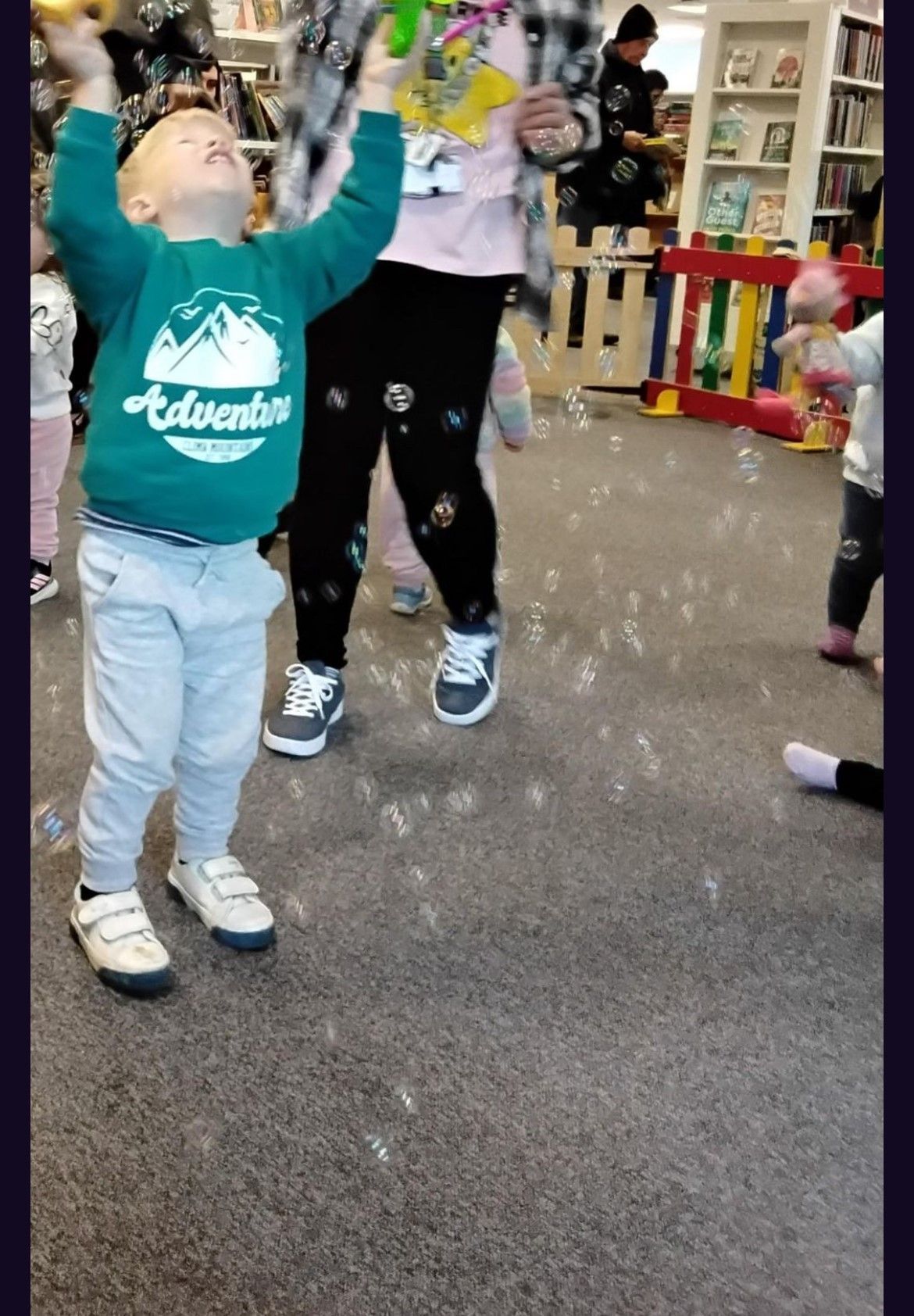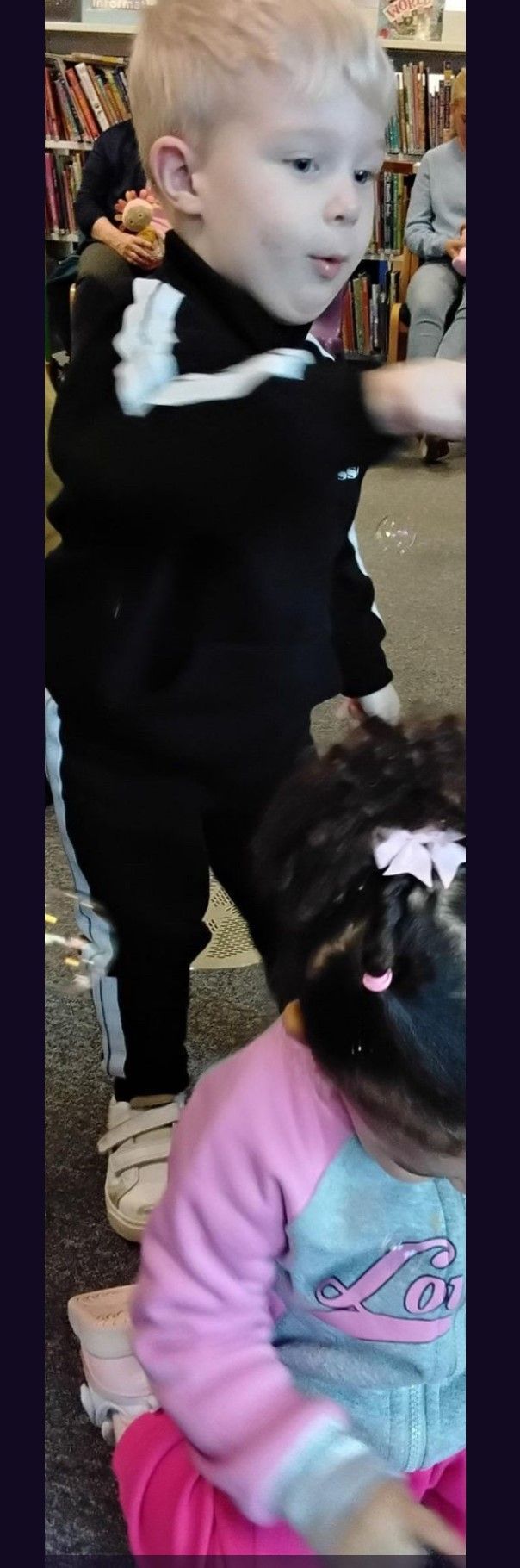 Once we arrived at the library we sat down on the carpet all together and listened carefully to the lady and her instructions. We enjoyed singing, dancing, bubbles and exploring musical instruments.